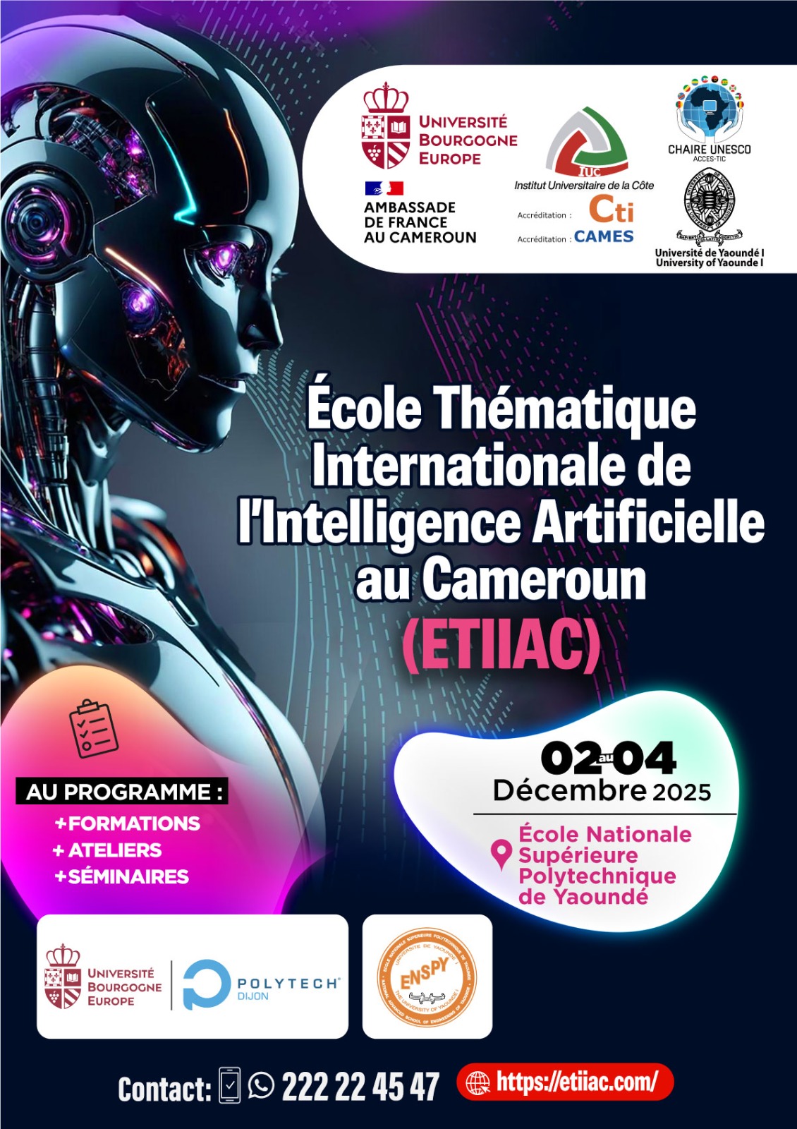 École Thématique Internationale de l’Intelligence Artificielle au Cameroun (ETIIAC) offre une formation d’excellence en IA. Séminaires internationaux, experts mondiaux, applications pratiques au Cameroun.